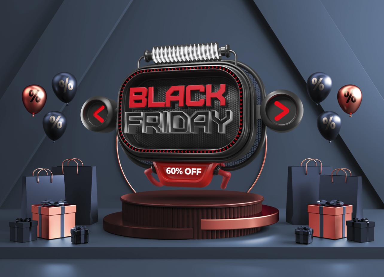 A Black Friday template 3D illustration is a visually striking digital design featuring eye-catching elements that emphasize the excitement of Black Friday sales. It typically includes bold typography, dynamic lighting effects, and 3D-rendered shopping-related objects such as shopping bags, discount tags, gift boxes, percentage signs, and neon sale banners. The color scheme often incorporates black, red, and gold, creating a sense of urgency and exclusivity.