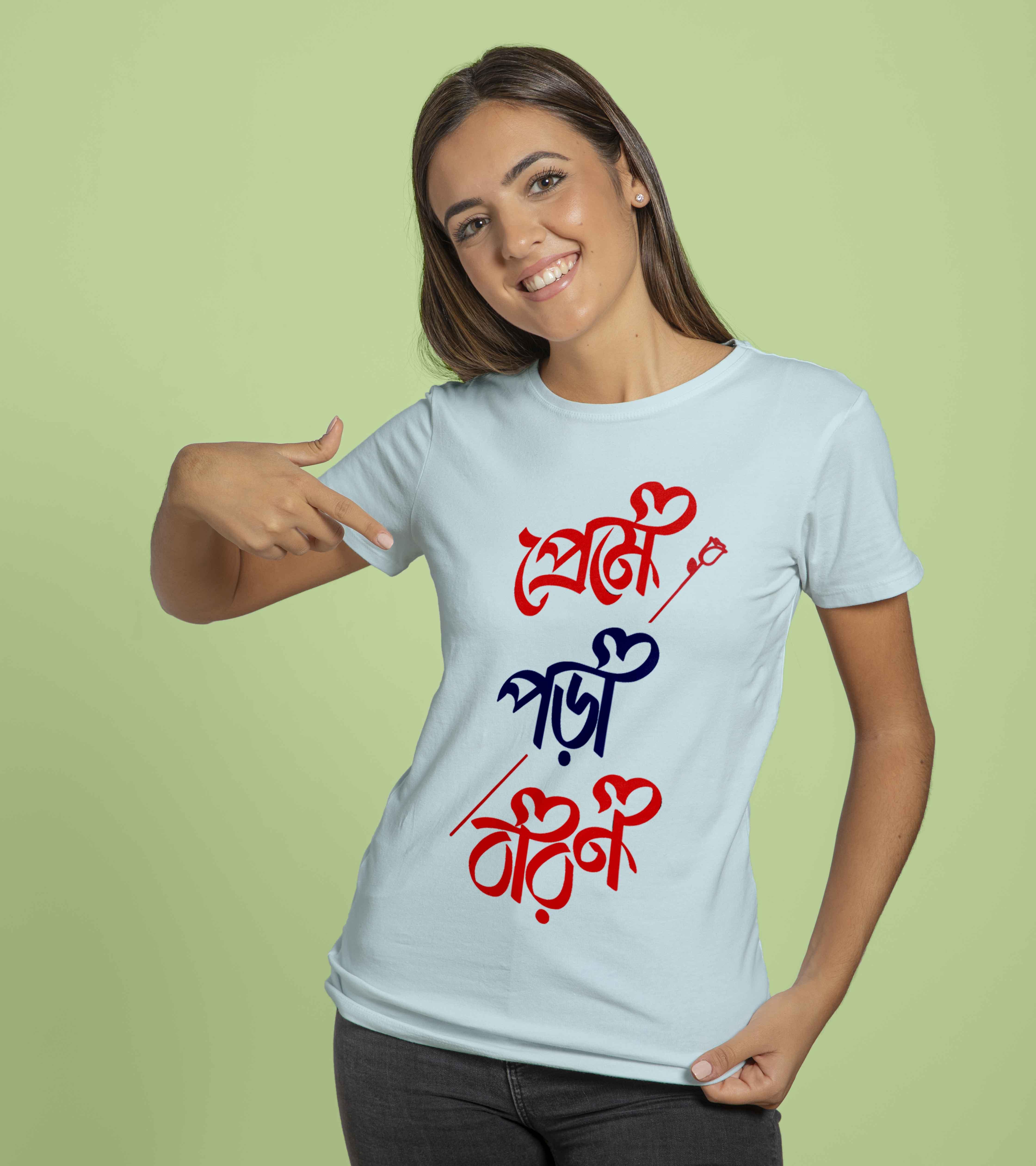 Looking for a unique Bangla T-shirt mockup? Download this high-quality "Preme Pora Baron" (প্রেমে পড়া বারণ) T-shirt mockup for free! This stylish Bangla typography design is perfect for creating trendy T-shirts, whether for personal use, online stores, or print-on-demand businesses.